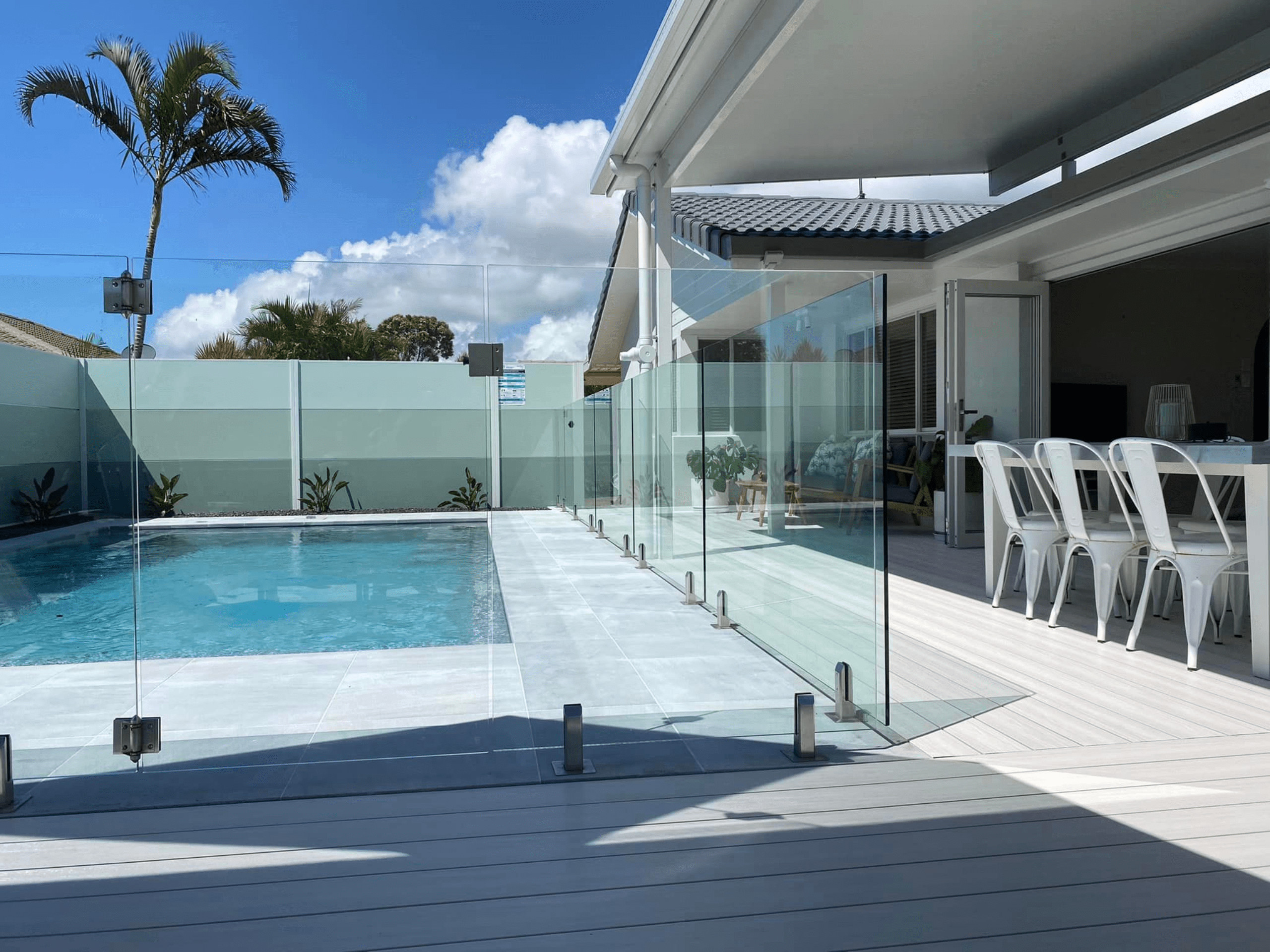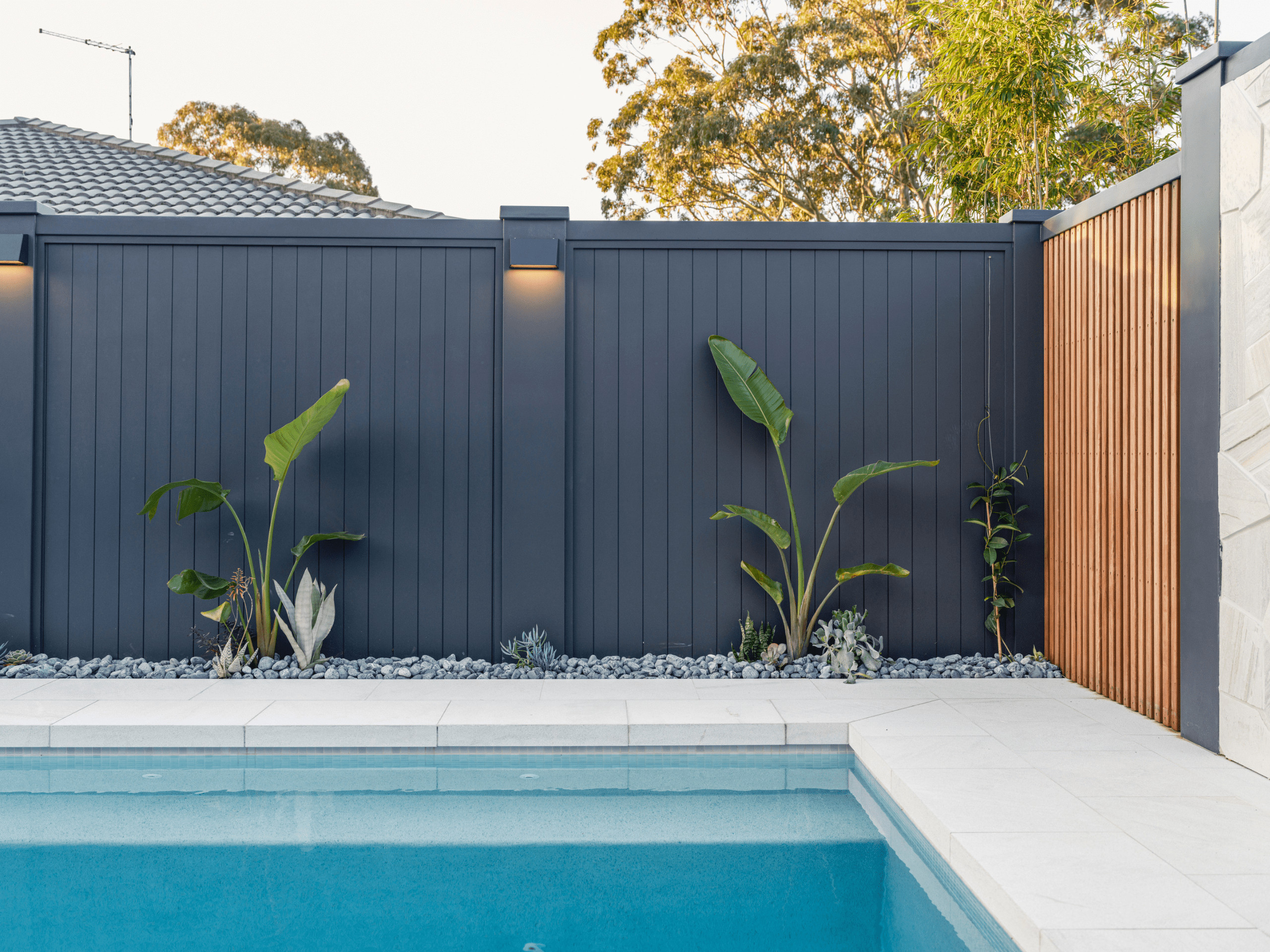 Previously, the pool fence was constructed from two different shades and styles of metal fencing. The assortment of materials and colours gave the backyard and pool area a dated, incohesive appearance.