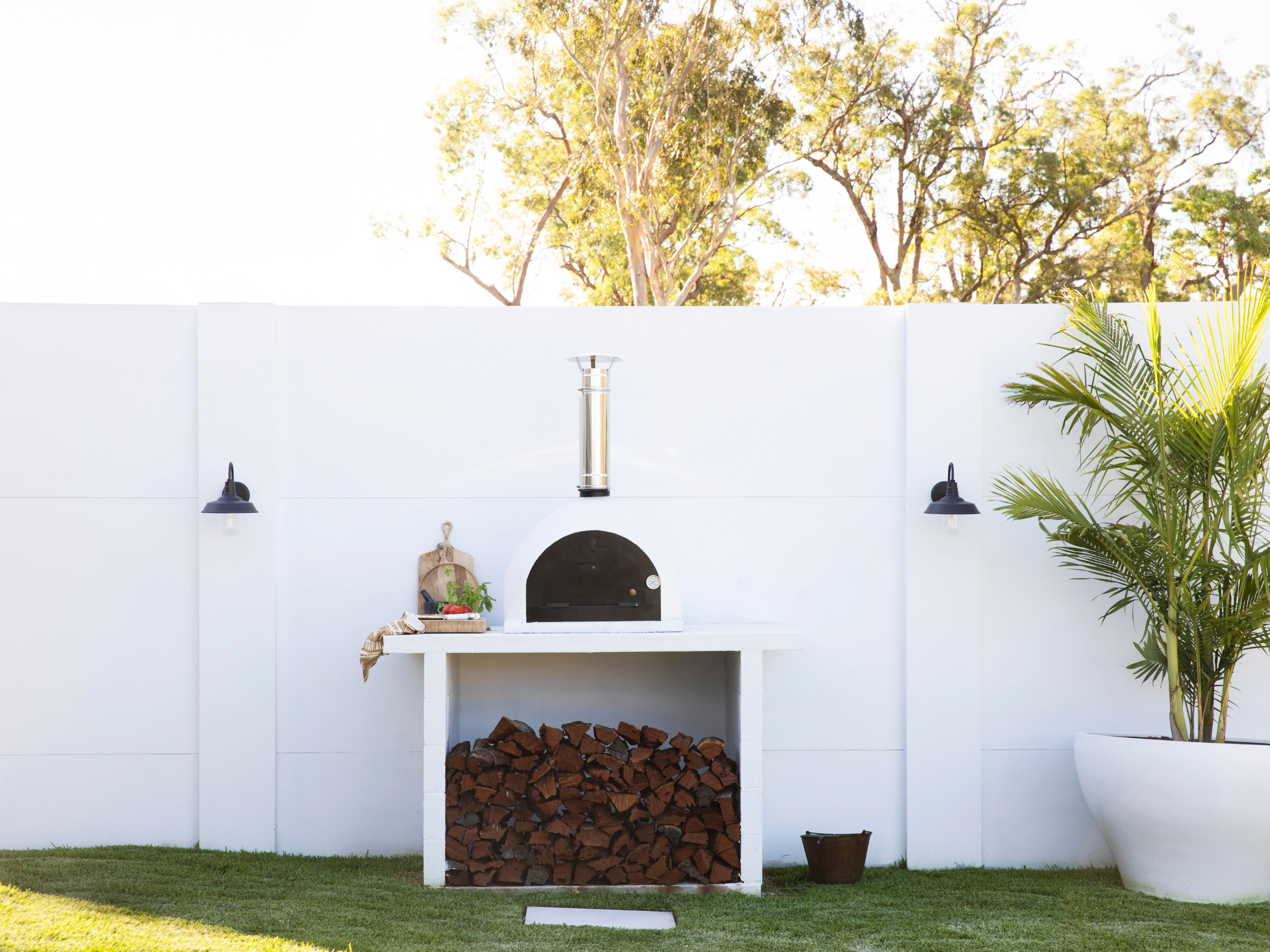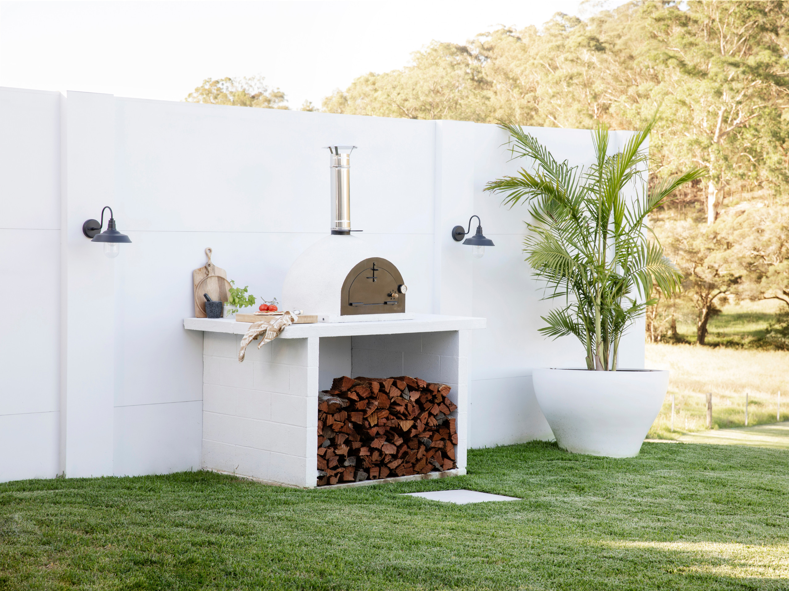 - Outdoor pizza oven feature wall: ModularWalls EstateWall with flush post tops and wall capping in Dulux Weathershield Lexicon half